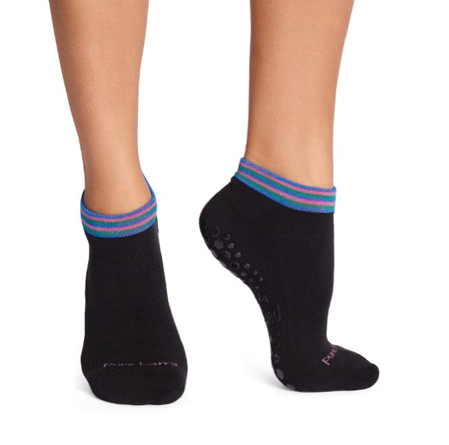Black sticky socks with bright blue, pink, and green stripes on ankle . Black grips.