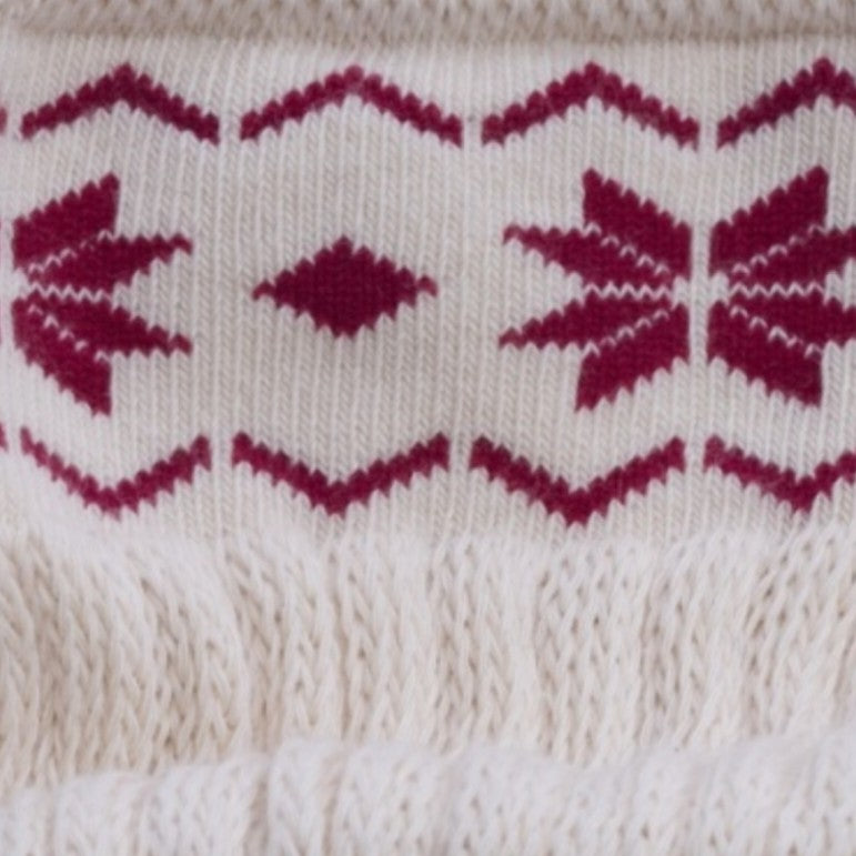 Cream high-rise crew socks with cranberry argyle print. Slouchy, knit upper. Cranberry grips.