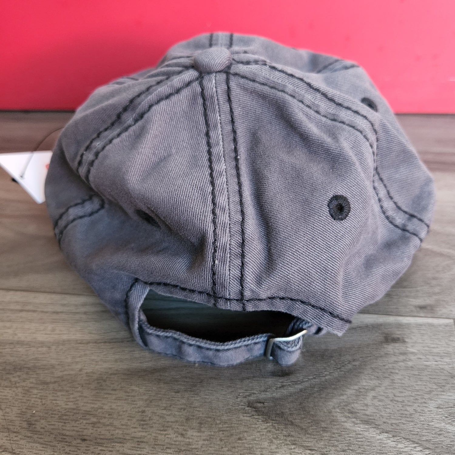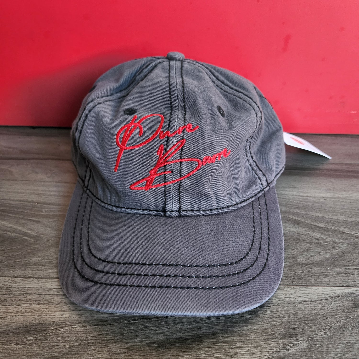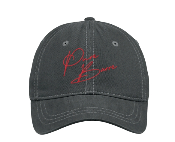 Adjustable hat in faded black with red, embroidered script Pure Barre.